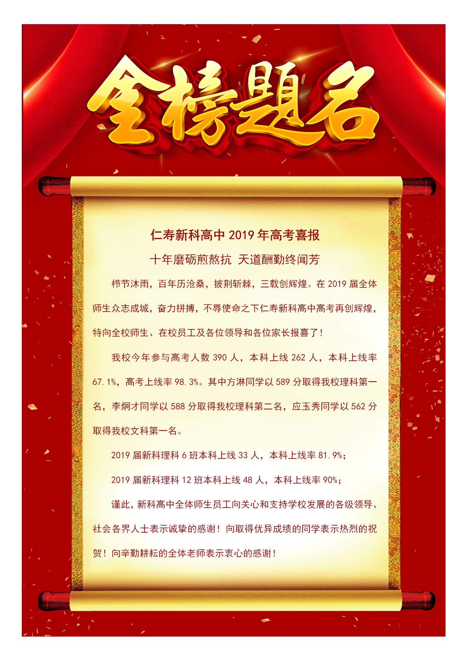 仁寿新科高中2019年高考喜报