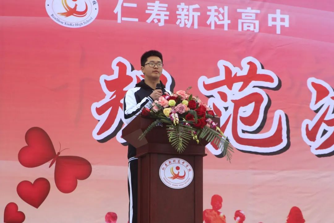 学生代表何天鹏号召全体同学在新学期不断提升自我,超越自我,成为一名优秀的新科学子。