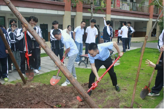 师生们挥锨刨土、填土压实、浇水灌溉,配合默契,植树现场一片欢声笑语,共同种下寄托着美好期待的银杏树。