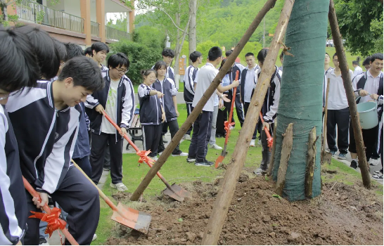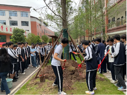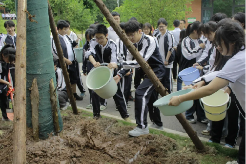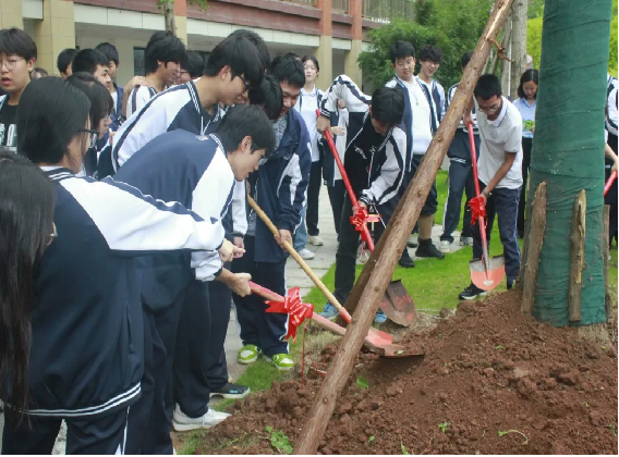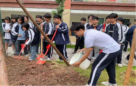 树高千尺不忘根,水流万里总思源。赠树、植树,是一份份情感的寄托与传承,愿同学们在高考战场乘风破浪,勇毅前行,一举夺魁。