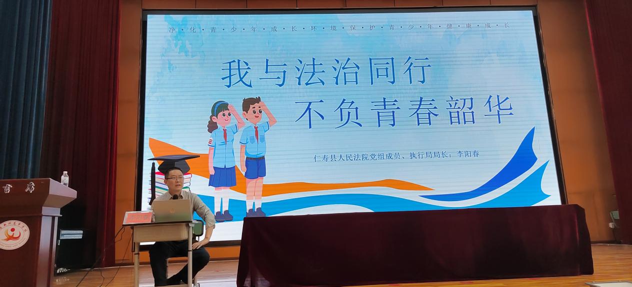 学校法治副校长、仁寿县人民法院执行局局长李阳春、仁寿县公安局怀仁派出所副所长刘杰,用生动的案例对学生进行拒绝校园欺凌、关注网络安全、预防青少年犯罪教育。
