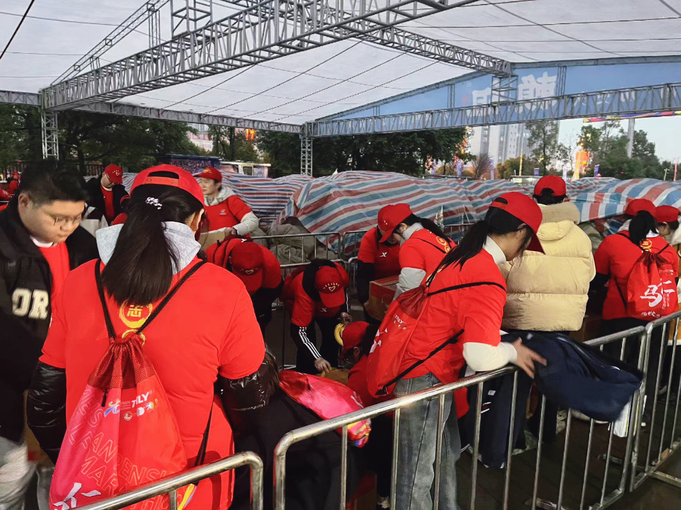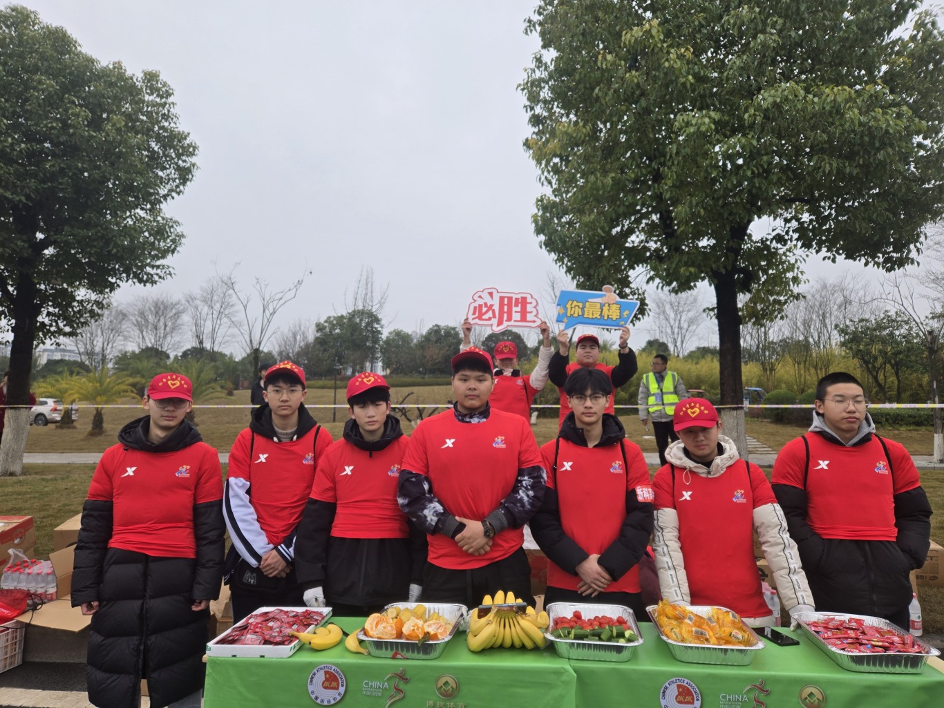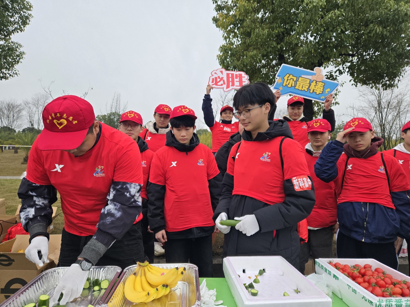 他们分工有序,团结合作,尽管天色昏暗,气温较低,但新科志愿者热情高涨,确保比赛顺利进行。