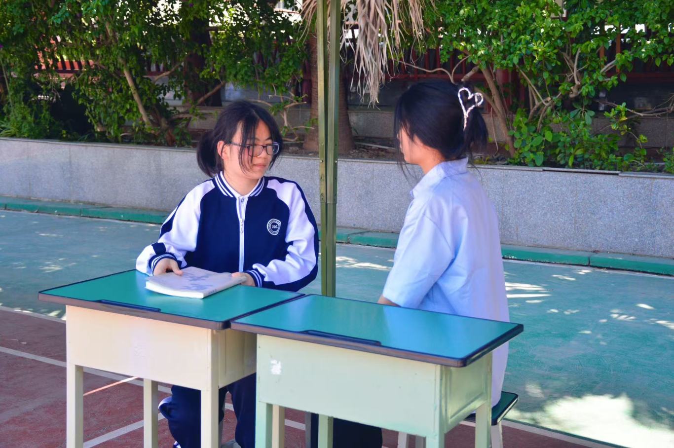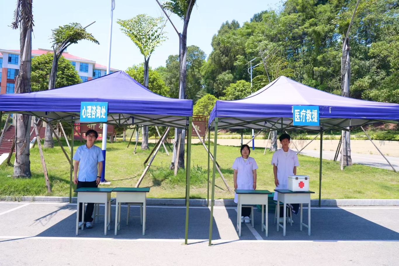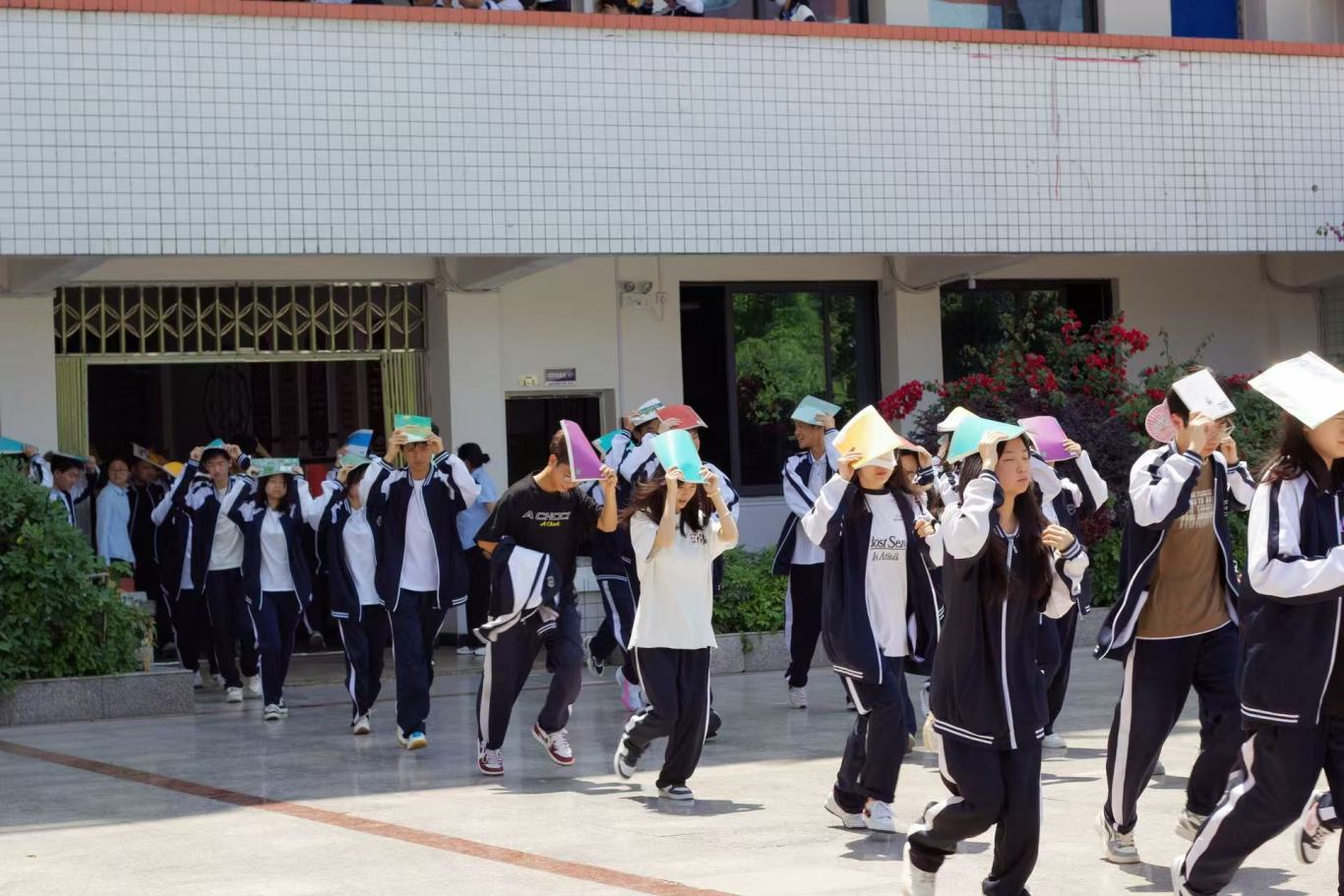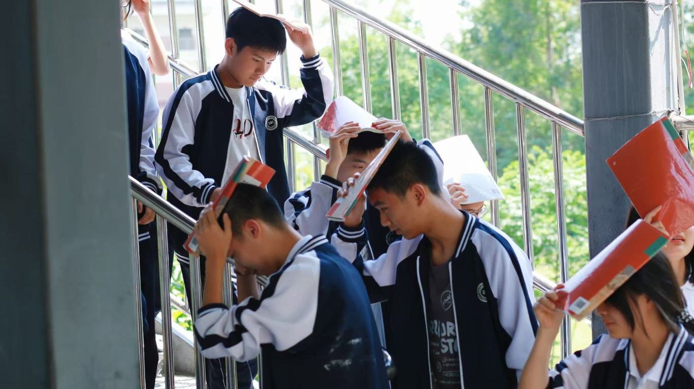 当第二次警报声拉响,各班教师、教官立即组织学生按照预定路线有序撤离。同学们弯腰低姿,用手、书本或书包护住头部,沿着楼梯快速、安静地向指定场地疏散。仅用5 分钟,各参演点位师生便安全集结,各班级迅速清点人数并上报。