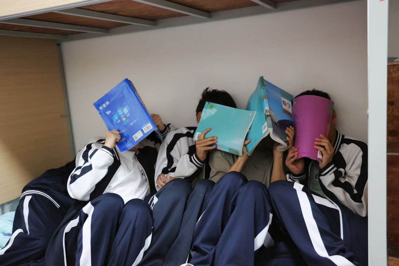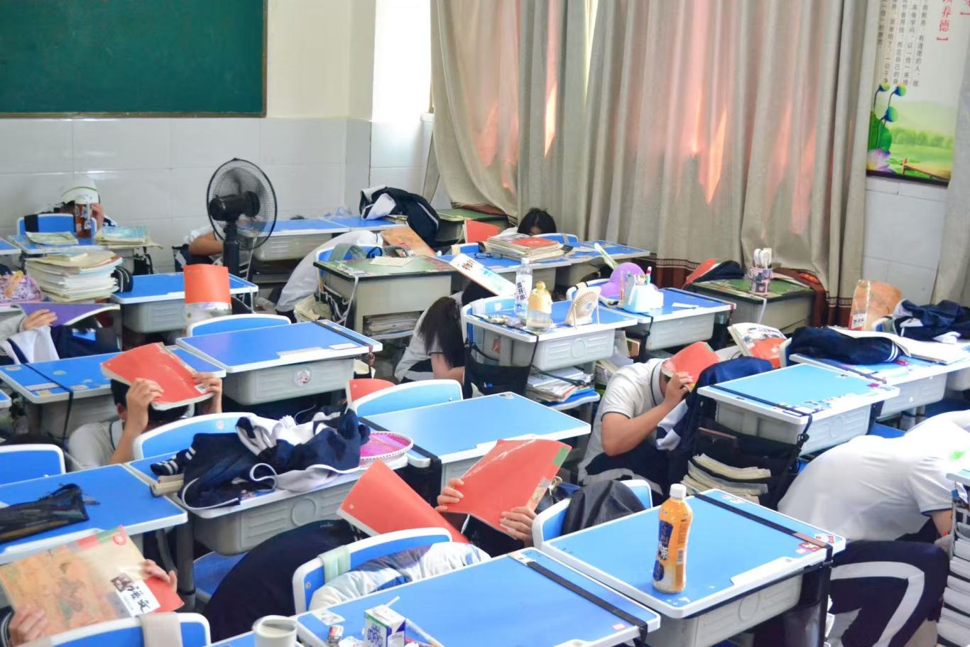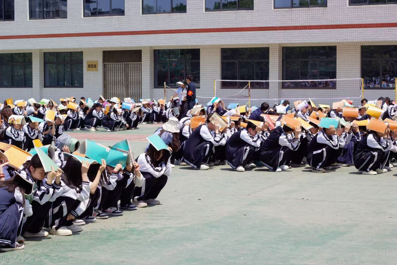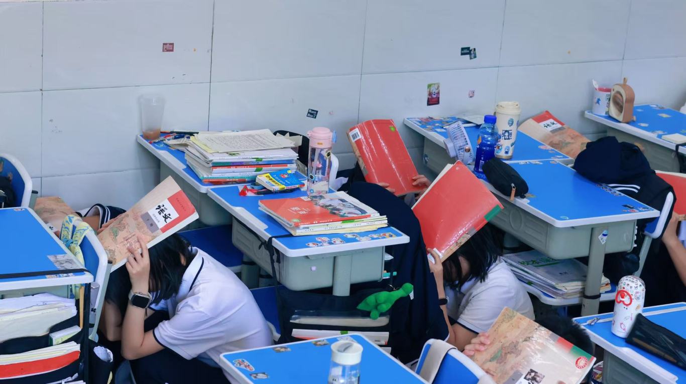随着第一次警报声骤然响起,正在教师、寝室的师生迅速反应,就近躲在课桌下,用书本护住头部,身体蜷缩,静待“地震波” 过去。