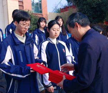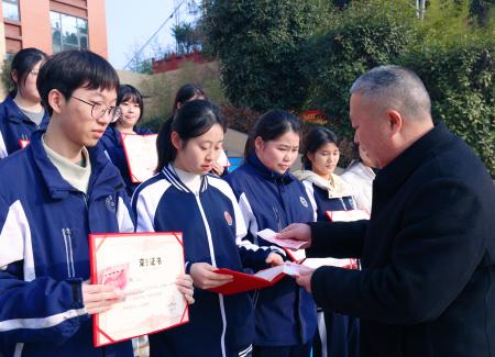 冬阳送暖,翰墨飘香。2026年1月14日上午,仁寿新科高中校园内洋溢着浓浓的文化气息与喜悦氛围。在学校勤政楼前,一场简单而庄重的颁奖仪式正在举行——仁寿县书法家协会、仁寿县美术家协会委托新科高中领导,为“庆元旦、迎新春”书画作品展中入选参展的8名学生颁发荣誉证书和奖金,以此激励在艺术道路上勤奋求索的新科学子们。